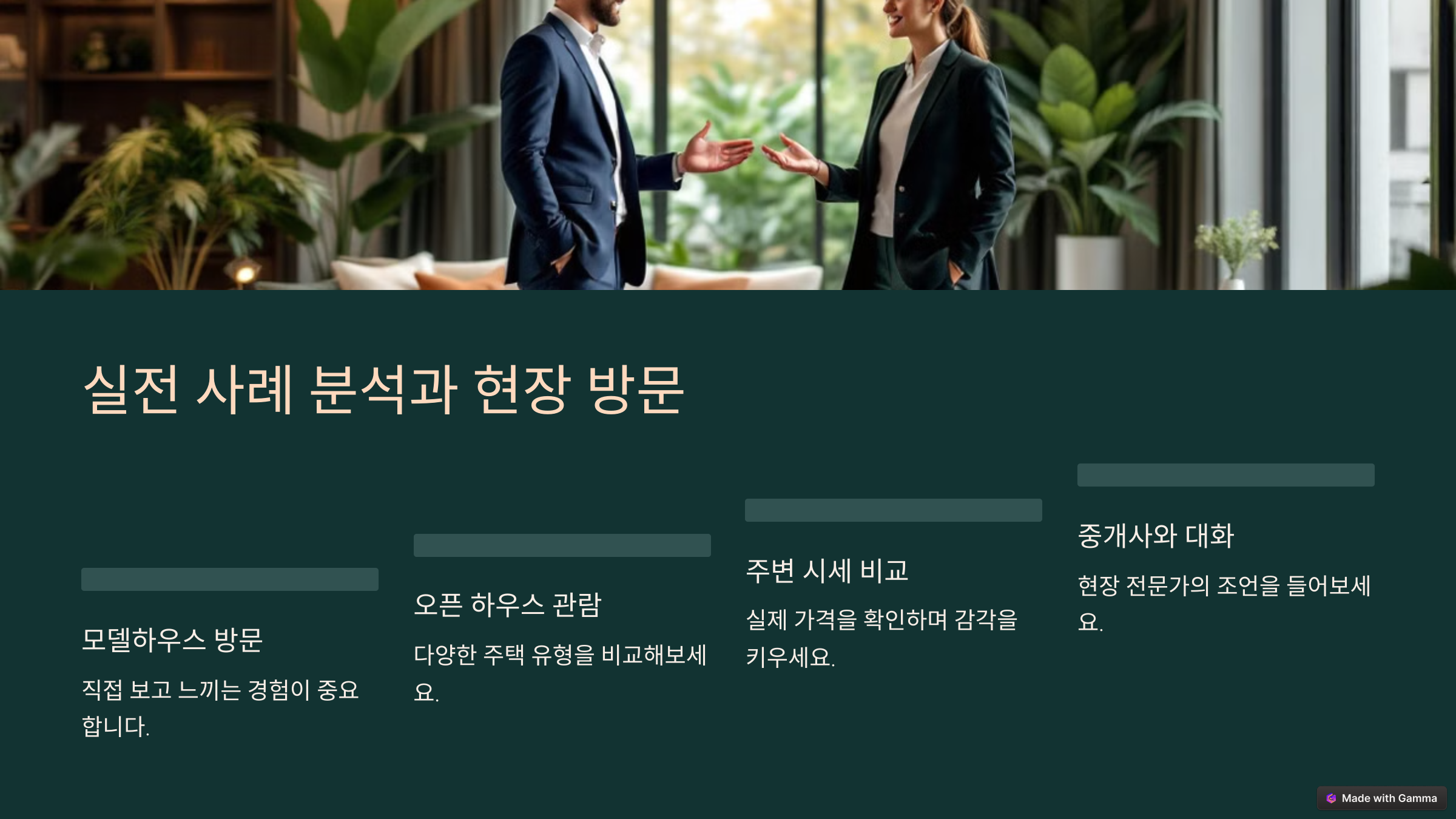 모델하우스 방문, 오픈 하우스 관람, 주변 시세 비교 등 실전이 최고의 스승입니다.